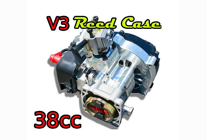 We're excited about this release. This 38cc reed has the new Fujiwara 40mm bore top end and our new V3 reed case. The V3 reed case has been completely redesigned with a new intake tract and a larger reed valve. V3 reed cases have the option of using the Fat Boy reed valve to run HDA series carbs. Between the new reed case and 40mm bore cylinder were seeing a massive increase in torque and mid range power compared to a 34cc.